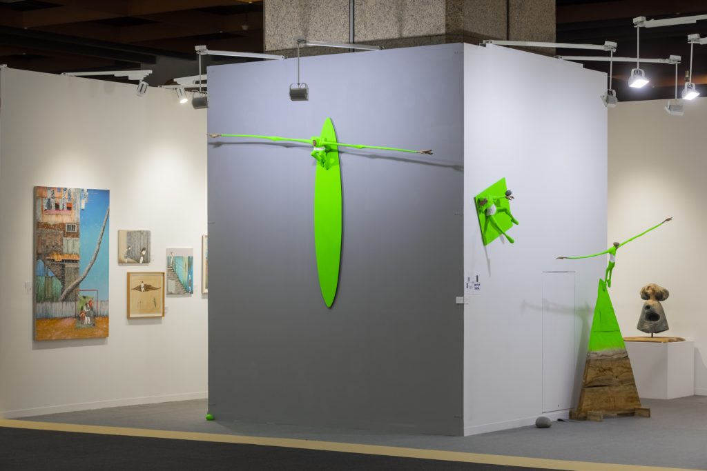 來自澳門的姜運威,創作經常源於對生命與際遇的觀察體會,將各種情緒與感受轉化為滑稽諧趣的造型作品呈現。「彳亍」,彳,左步,亍,右步,指漫步行走或時走時停。而生命之行,是由個體無時無刻面臨的各種選擇所推進,或反覆或變動,或主動觸及或被動應對,串連了事件的發生,一個人的選擇也經常比任何加諸的形容都更能夠體現其本心。