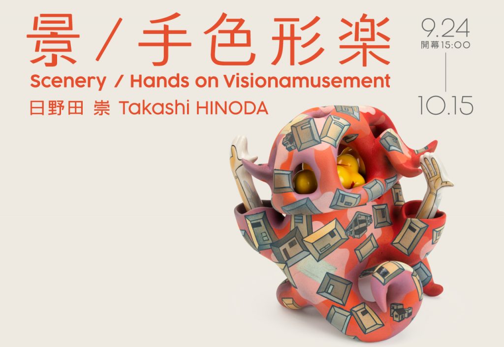 京都陶塑藝術家日野田崇 (1968~) 睽違六年再次於台北舉行個展「景/手色形楽」。以陶土為基本媒材,半抽象物形或怪誕不經卻張力十足,覆蓋讓人聯想到日式漫畫風格的多彩圖繪,覽賞立體雕塑的造型感並閱讀其色彩計畫下勾勒的語境,是手色形樂的一大特色。