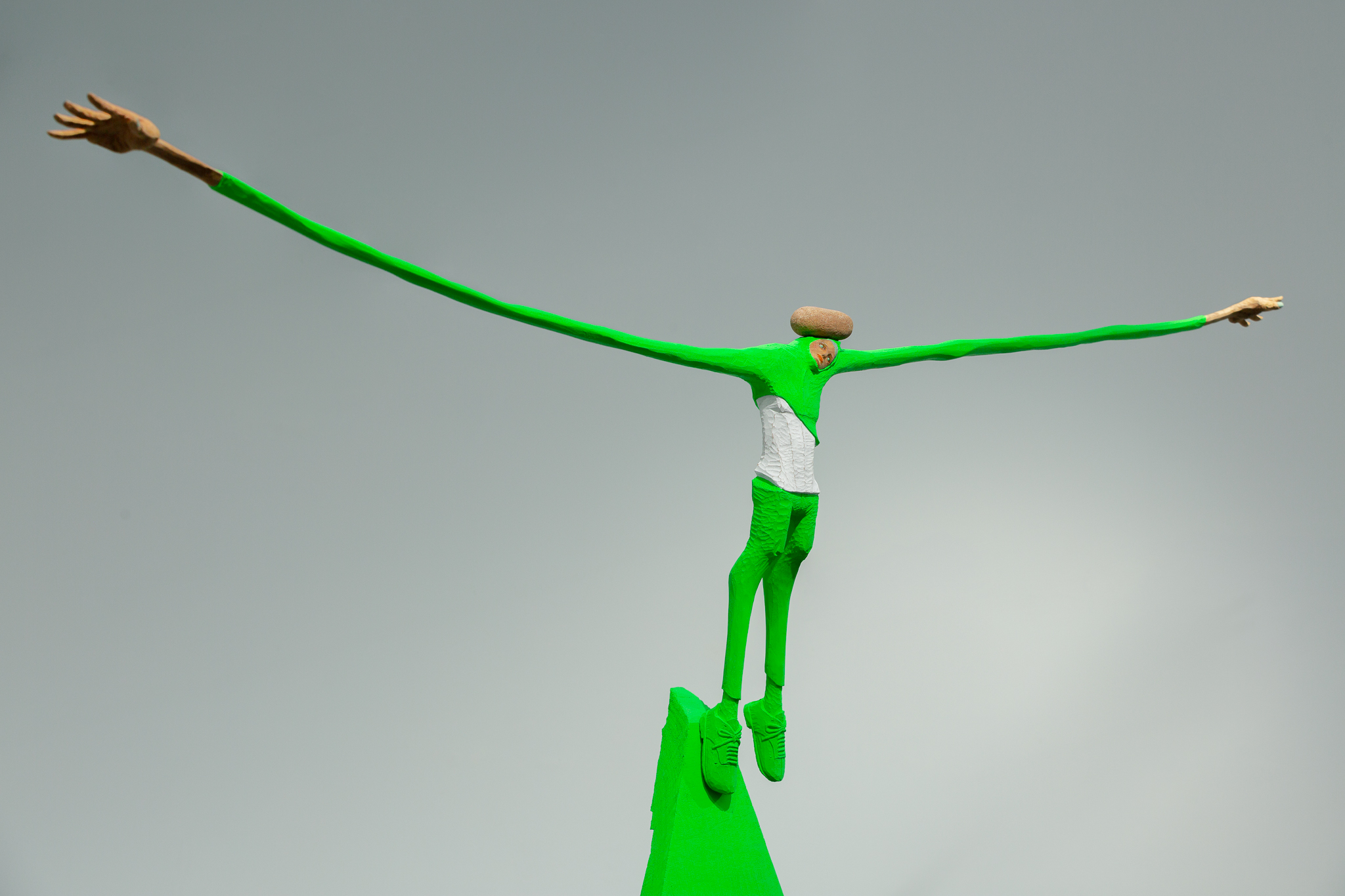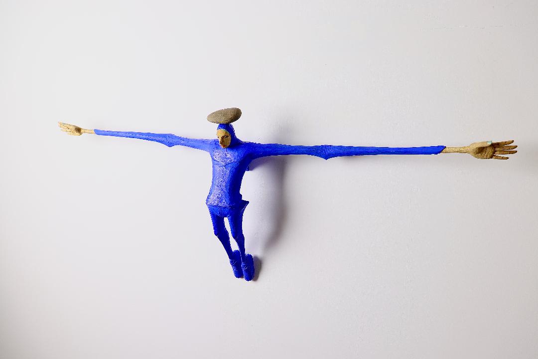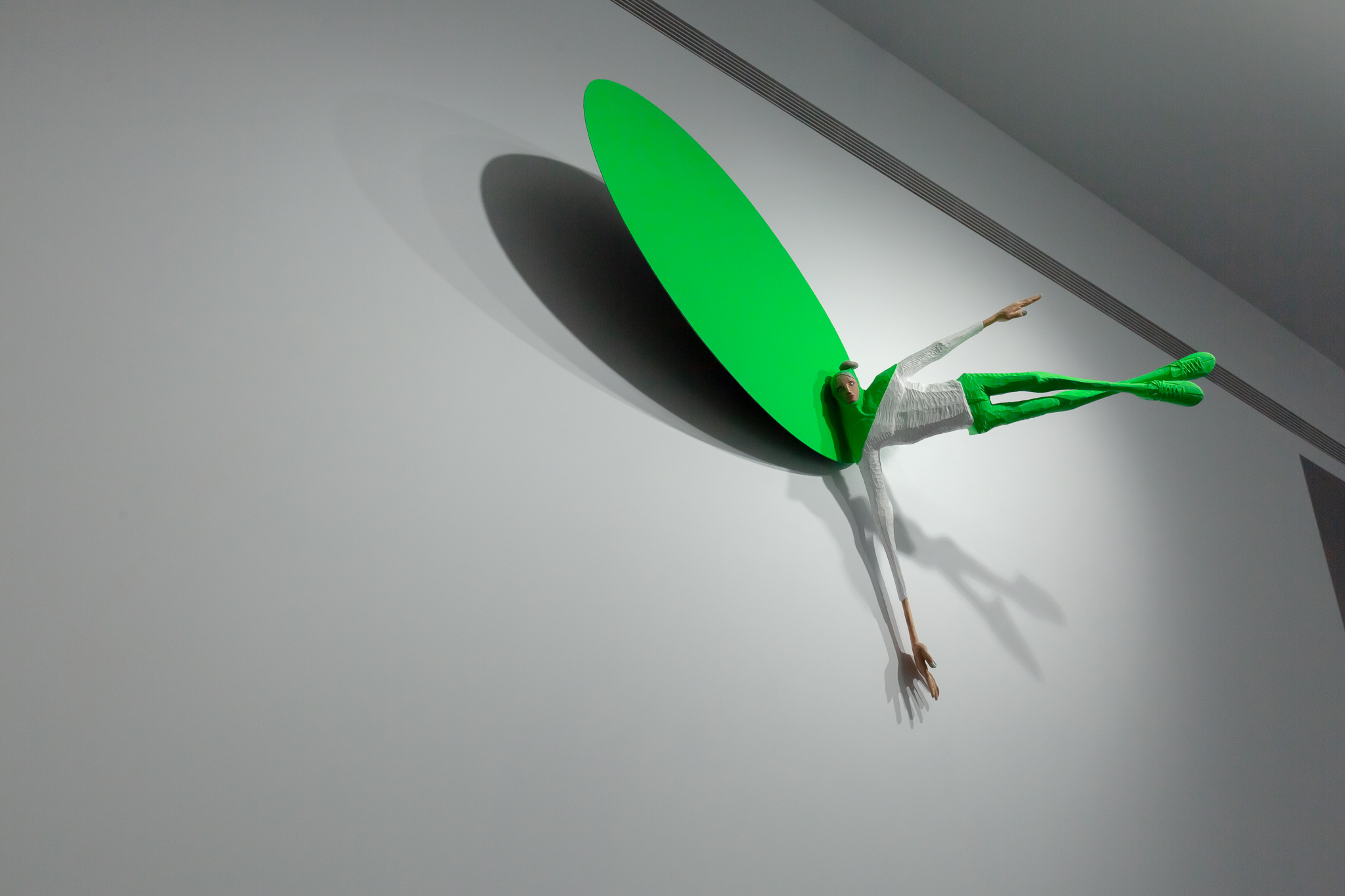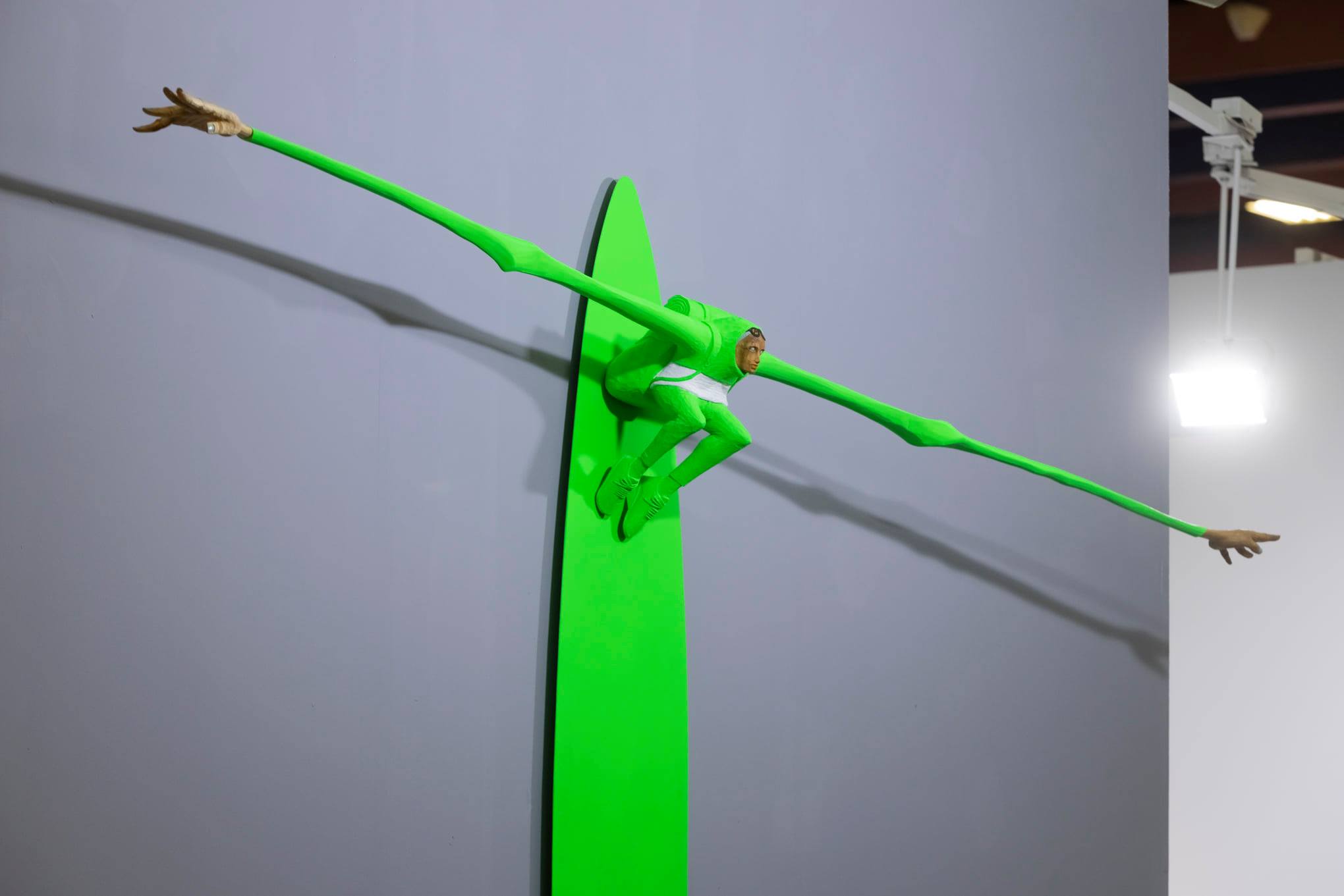 創作的原點是藝術家將自身的價值與經驗投影在作品中的寫照。在作品中他將自己隱身為雕塑,拉長了自己飛翔在空中穿越了時間與空間的限制,似乎讓自己展望到他所企盼的未來一般,伸展了自己的可能性。透過延展的身軀強化了造形的趣味與好奇外,變形後的造形力量也與自身欲望擴展出對話空間。從作品中我們可以領受到那份帶有著一點不安的欣喜與興奮感。