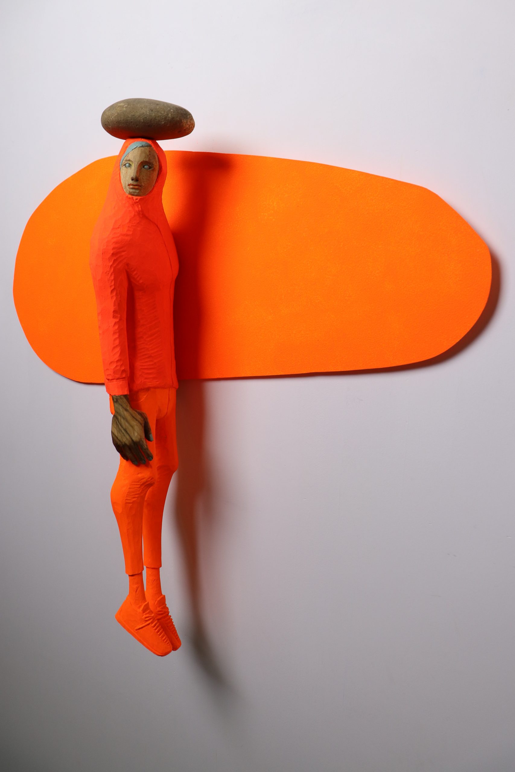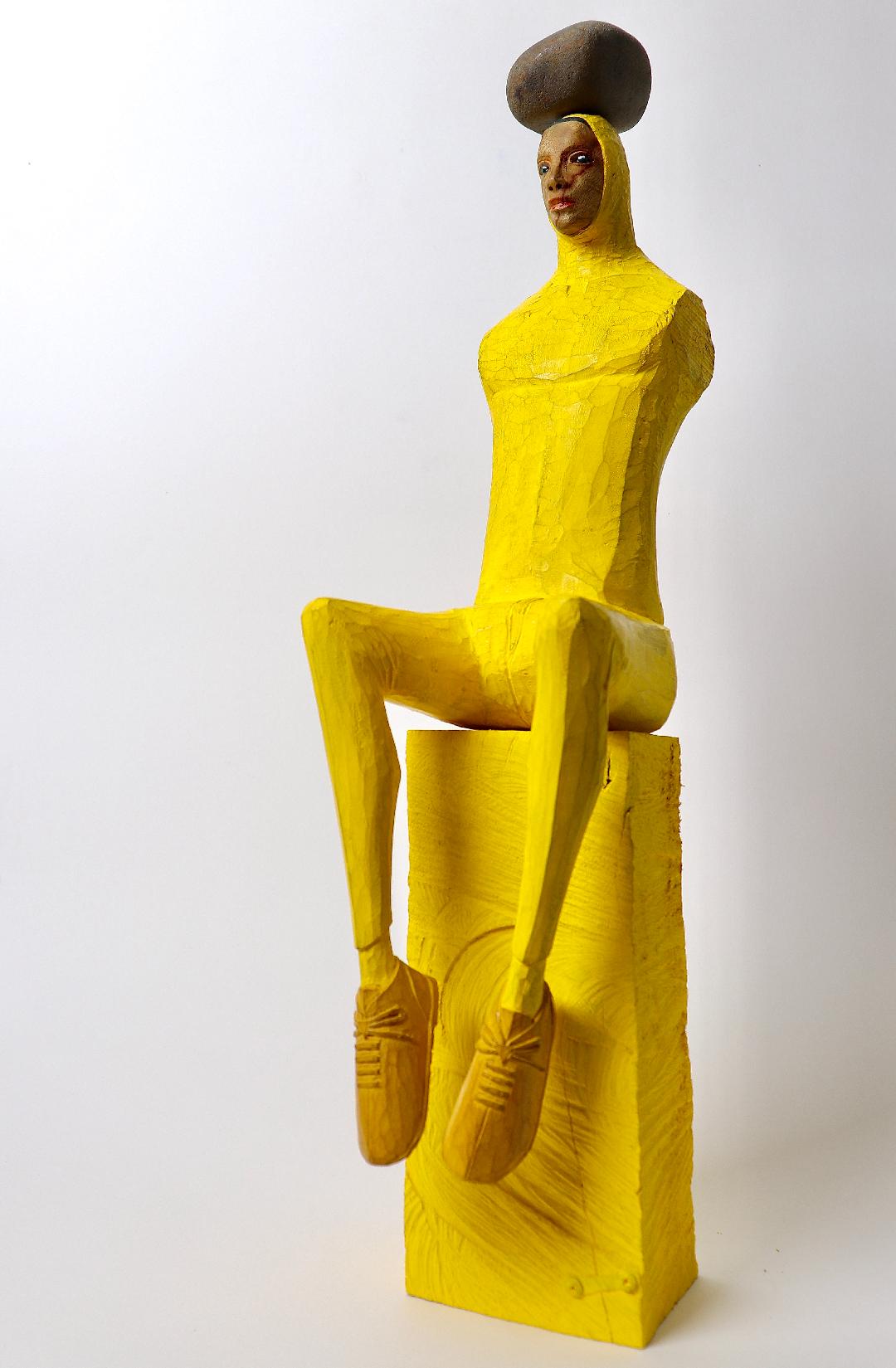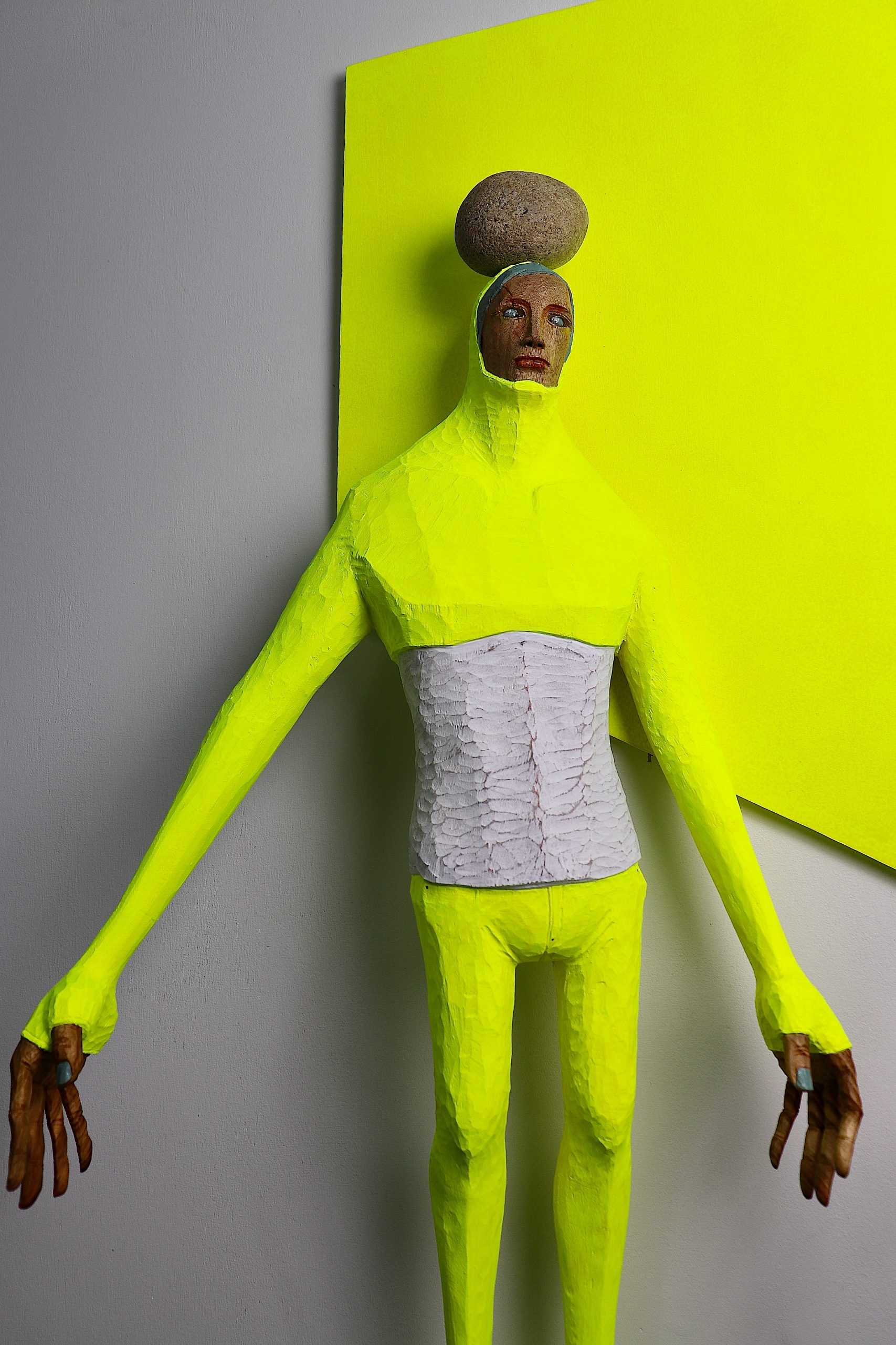 創作的原點是藝術家將自身的價值與經驗投影在作品中的寫照。在作品中他將自己隱身為雕塑,拉長了自己飛翔在空中穿越了時間與空間的限制,似乎讓自己展望到他所企盼的未來一般,伸展了自己的可能性。透過延展的身軀強化了造形的趣味與好奇外,變形後的造形力量也與自身欲望擴展出對話空間。從作品中我們可以領受到那份帶有著一點不安的欣喜與興奮感。