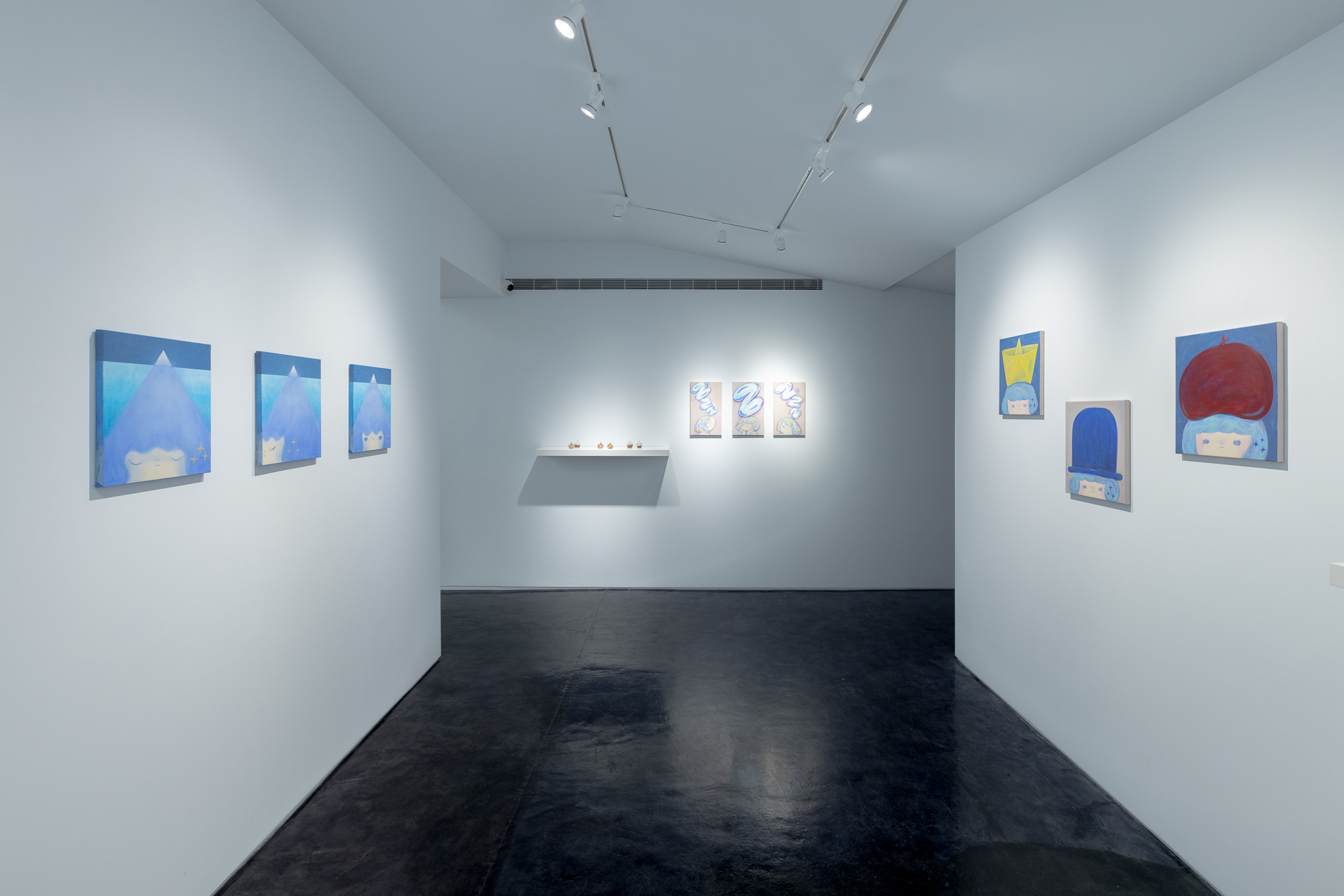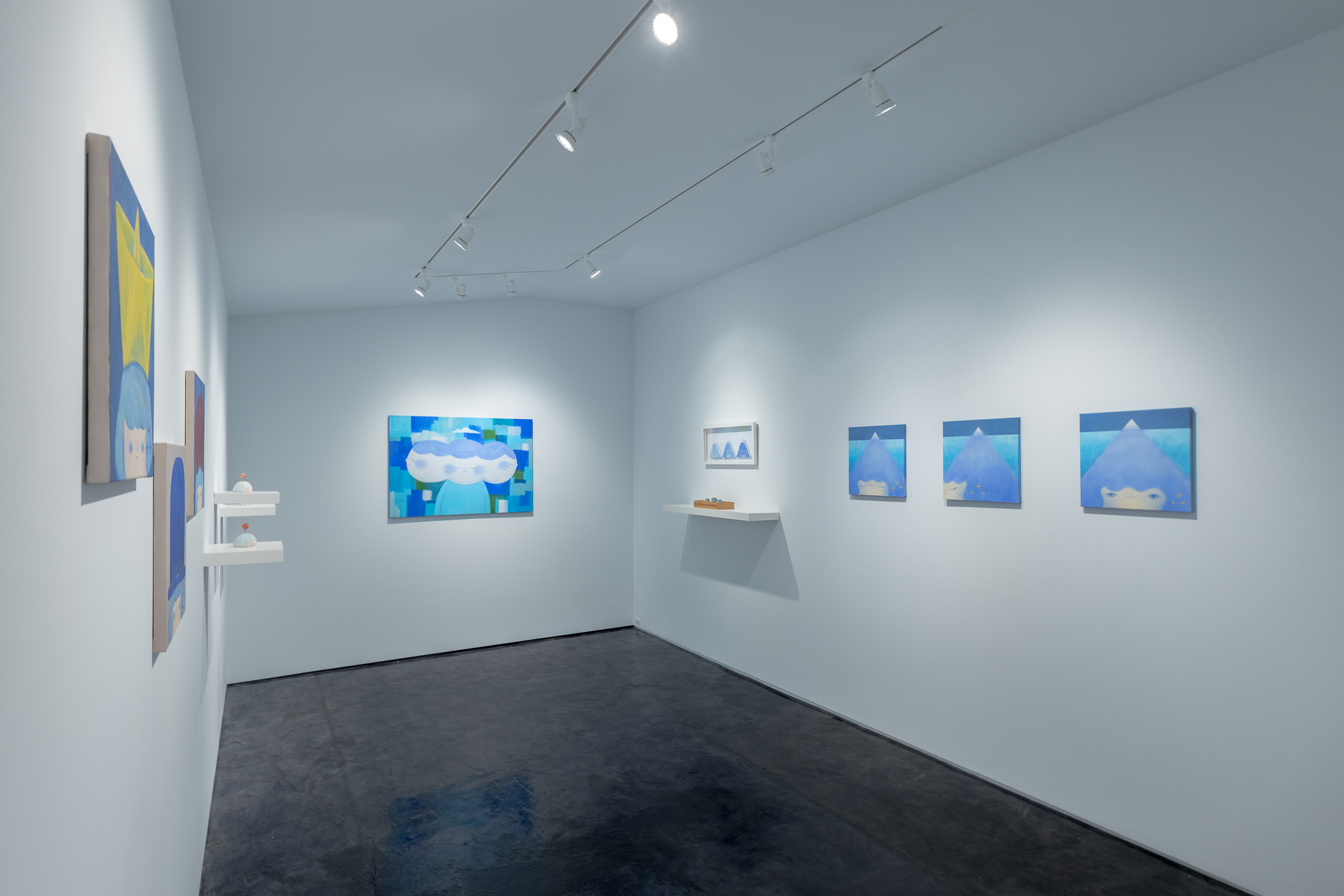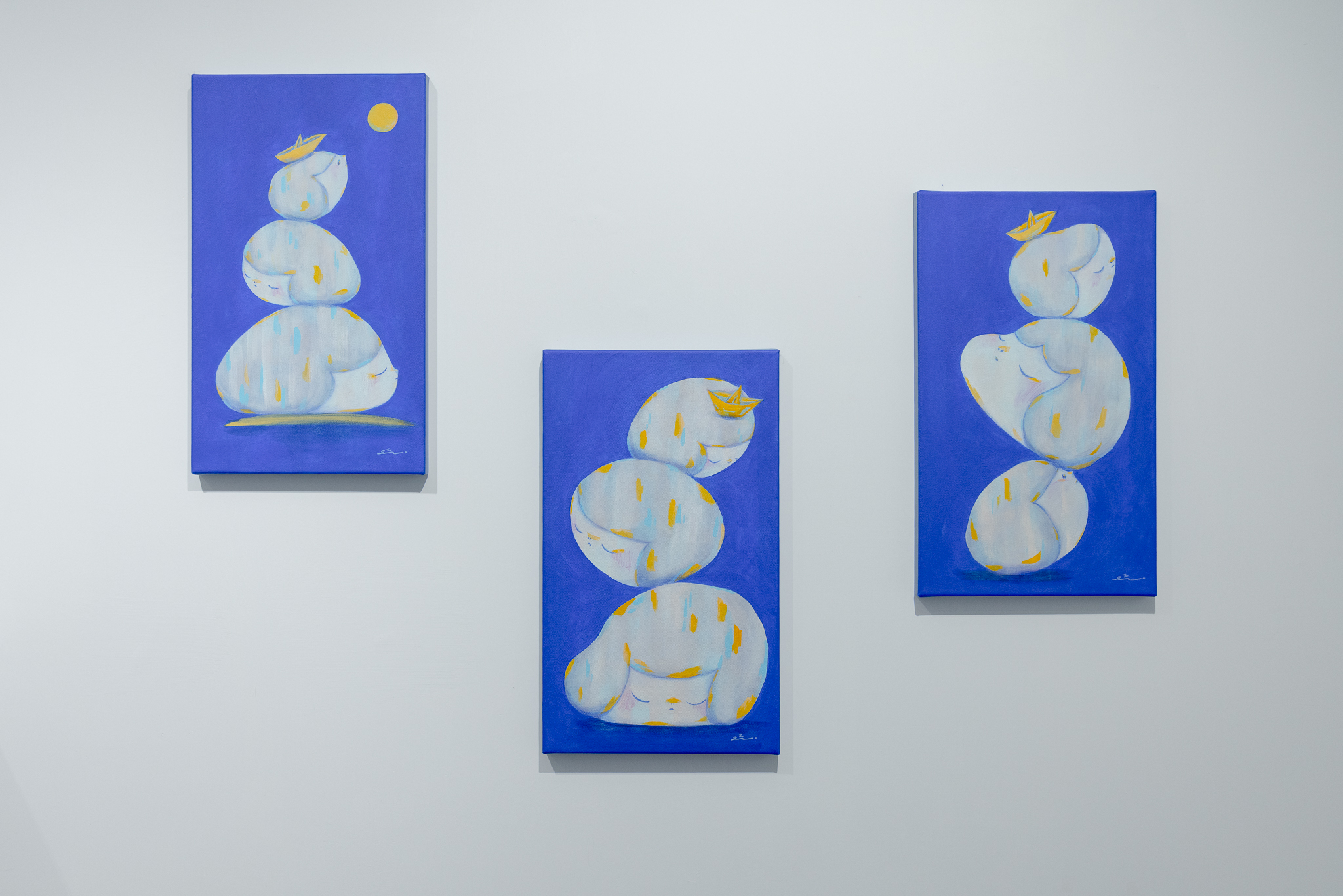許匡匡⼀貫鍾愛以藍色調進⾏繪畫,為童趣的主題渲染上富層次變化的情緒張力,⽽在⼤面積不同⾊階堆疊的藍中加入一絲暖色,是近期的新嘗試,讓畫⾯氛圍與以往的呈現有了微妙的轉變,如匡匡自述:『讓人感受冷靜之下的情緒,像冰山就包裹了一點點蟄伏的不安』。