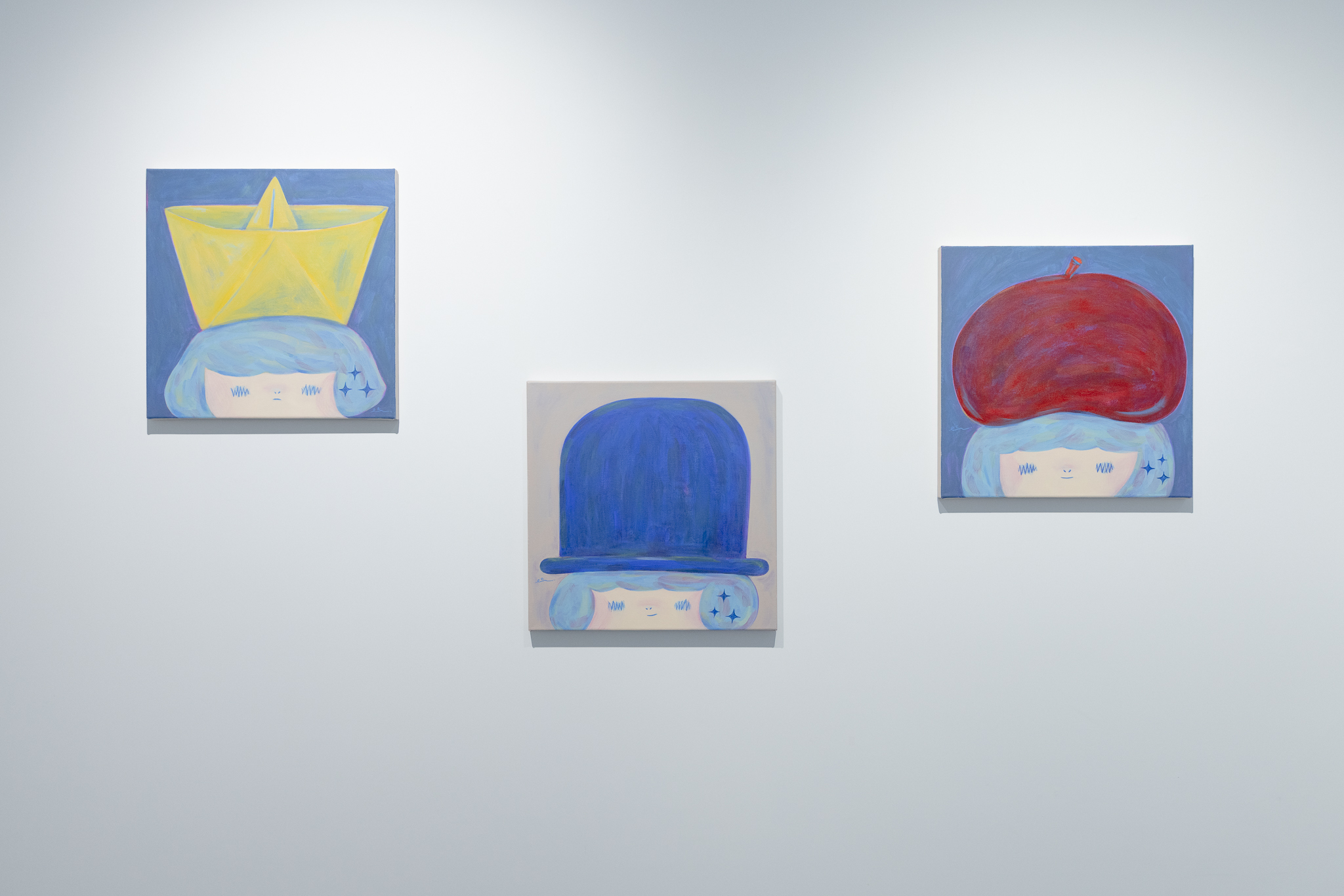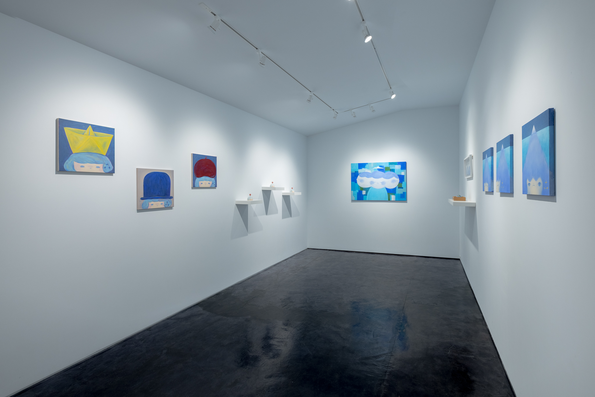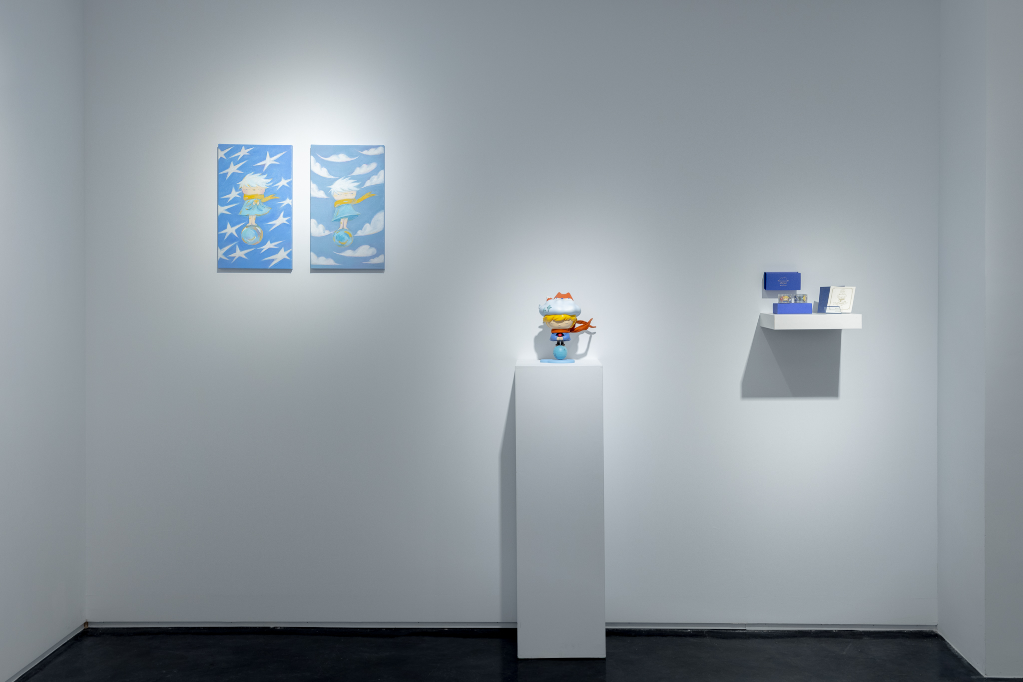 許匡匡⼀貫鍾愛以藍色調進⾏繪畫,為童趣的主題渲染上富層次變化的情緒張力,⽽在⼤面積不同⾊階堆疊的藍中加入一絲暖色,是近期的新嘗試,讓畫⾯氛圍與以往的呈現有了微妙的轉變,如匡匡自述:『讓人感受冷靜之下的情緒,像冰山就包裹了一點點蟄伏的不安』。