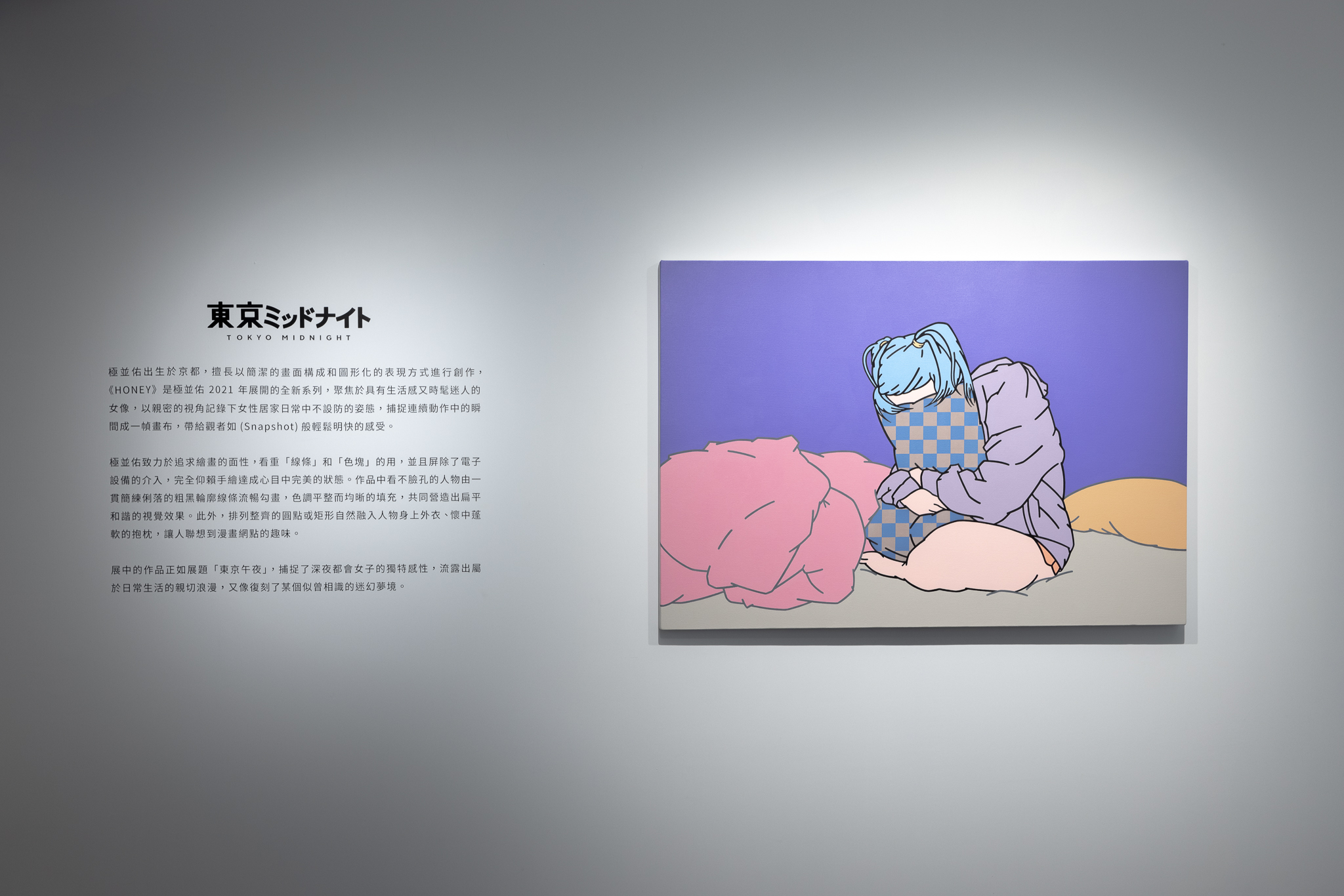HONEY是極並佑2021年展開的全新系列,聚焦於具有生活感又時髦迷人的女像,以親密的視角記錄下女性居家日常中不設防的姿態,捕捉連續動作中的瞬間成一幀畫布,帶給觀者如(Snapshot)般輕鬆明快的感受。極並佑致力於追求繪畫的平面性,看重「線條」和「色塊」的運用,並且屏除了電子設備的介入,完全仰賴手繪達成心目中完美的狀態。HONEY系列中看不臉孔的人物由一貫簡練俐落的粗黑輪廓線條流暢勾畫,稍微降低了彩度的色調平整而均晰的填充,共同營造出扁平和諧的視覺效果。此外,排列整齊的圓點或矩形彩自然融入人物身上寬鬆的外衣、懷中蓬軟的抱枕,讓人聯想到類似漫畫網點的趣味,是畫中如韻存在的亮點。