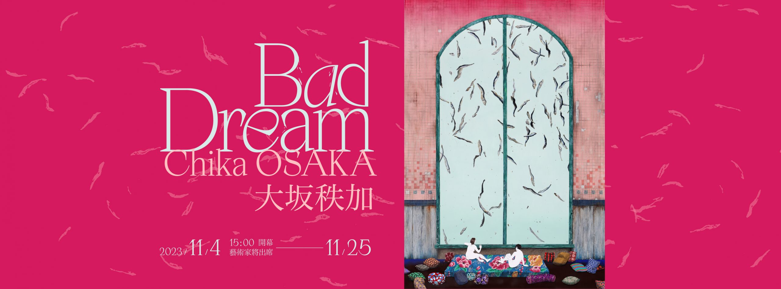 「夢」 意指在睡眠中讓人感到真切的意象,大坂秩加認為自己的繪畫與文字作品在某種程度上同「夢」的特質高度相似—既歸屬為一種虛構,又反覆游移於真實(原:本物)與現實(原:リアル) 之間交互涵射。在【Bad Dream / 不愉快的夢】中,大坂以細膩寫真的筆法為超現實的夢境虛像搭建實景,局部並採用鑿痕等特殊手法仿擬物質表面肌理強化立體感,畫面佈局彷若劇場舞台,你我旁觀畫中人的同時也共享他們的所見。所謂「不愉快的夢」並不直接等同於惡夢,就像生活不是非黑即白,在更為迷離的夢的世界,邊界的消融疊合、嵌套反轉也都更富層次。這也是疫情之後,藝術家開始構思一檔能使不同種族文化的人們對世界的不確定性達成共識的個展,創作內容不受地點和角色國籍限制,其中也融入了不少台灣傳統的圖案等元素。