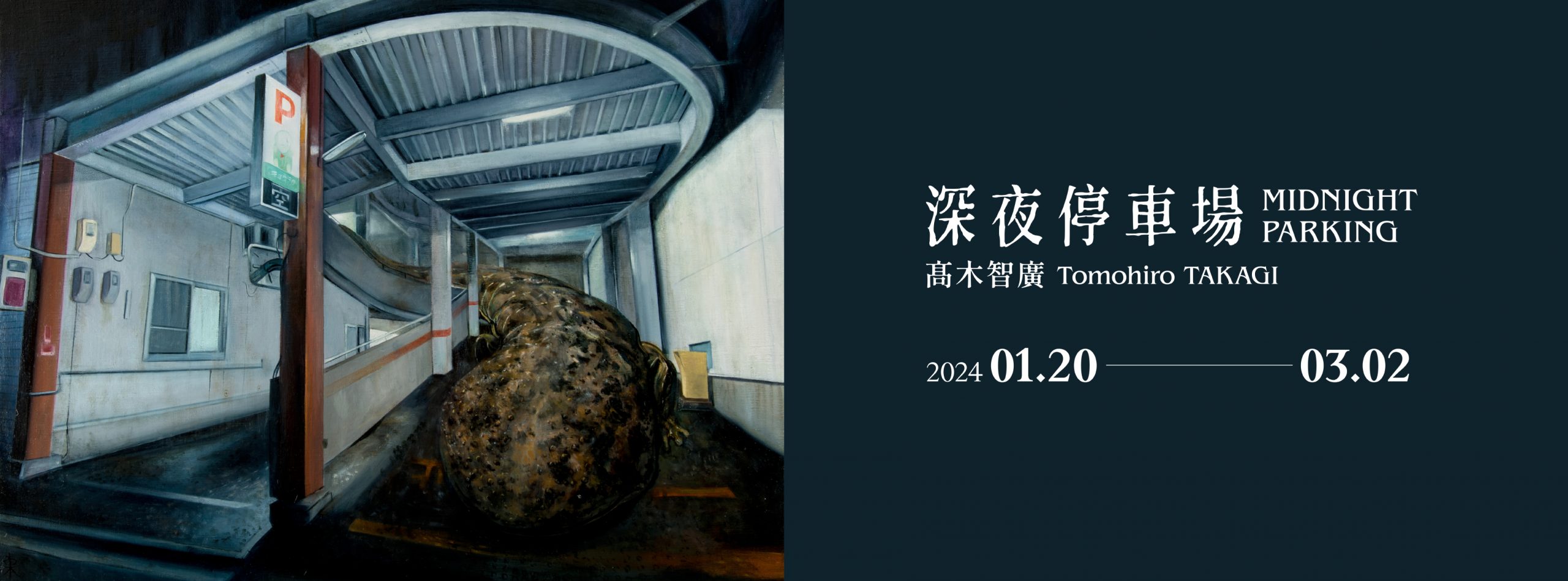 睽違多年雲清藝術很榮幸再次邀請高木智廣Tomohiro TAKAKI來台舉辦個展,本次個展以作品《深夜停車場》為題,呈現似於相對沒有被修飾的停車場空間中暗夜中冷澀的白燈一如往常照映著空蕩深邃的車道,這般熟悉不過的場景,卻在巨型爬蟲以不思議的存在感映入眼簾的同時倏然變了調。