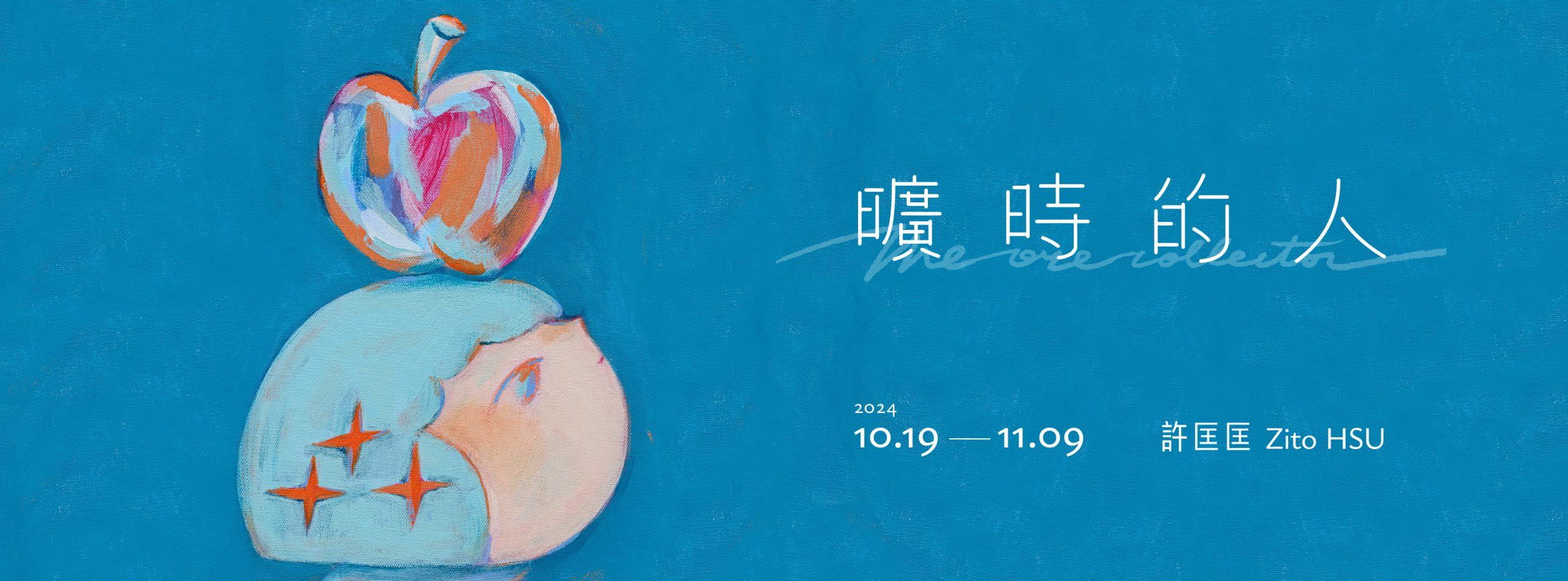 The exhibition’s main visual, Knock on the Head, features Zito’s signature blue-haired girl with a bright red apple atop her head. Whether it’s the apple or a smooth stone, these elements represent people’s longing for beauty. In Zito Hsu’s work, symbols are often intertwined, and through his unique artistic language, she invites us to closely examine the captivating wonders of the world.