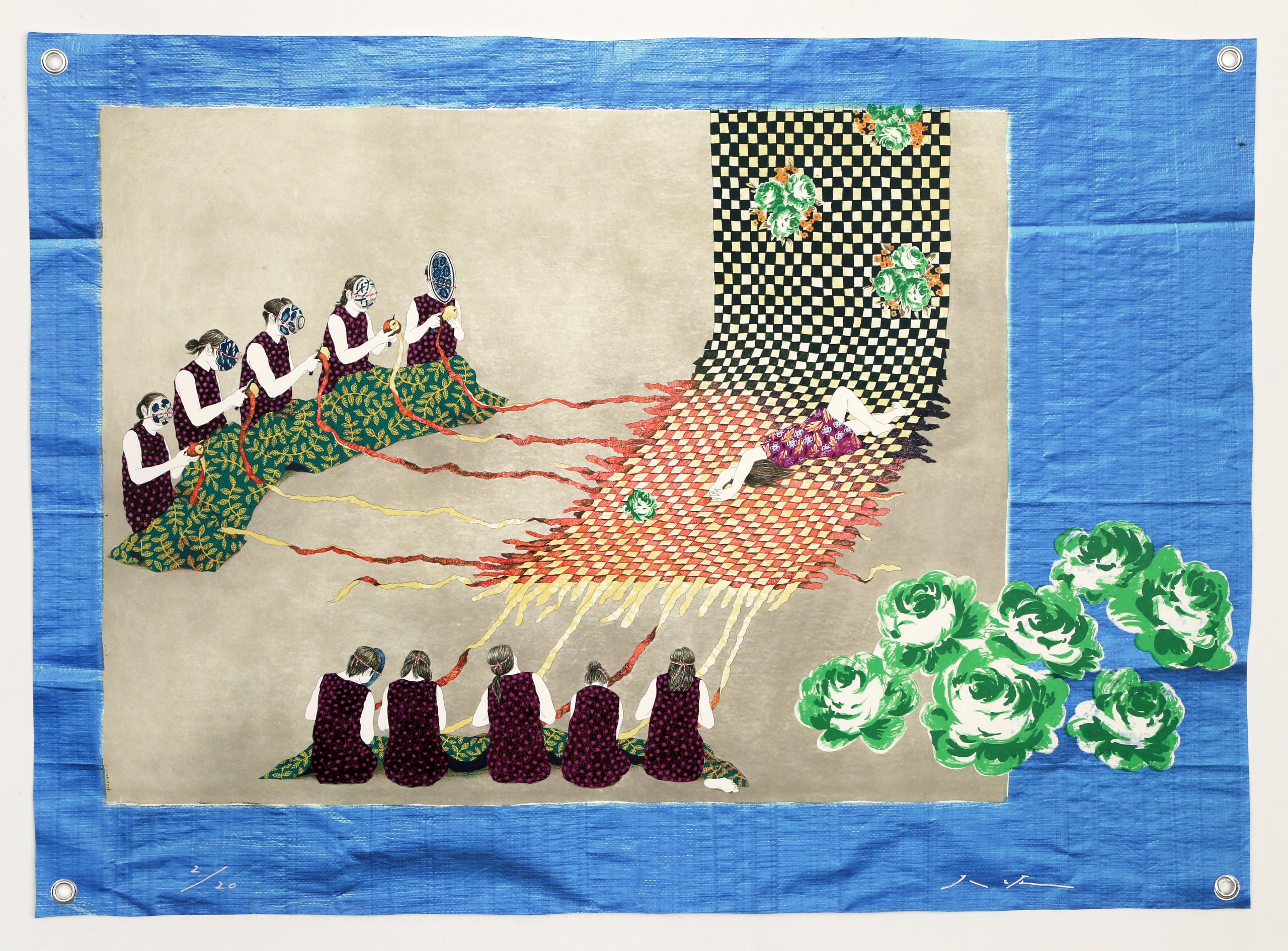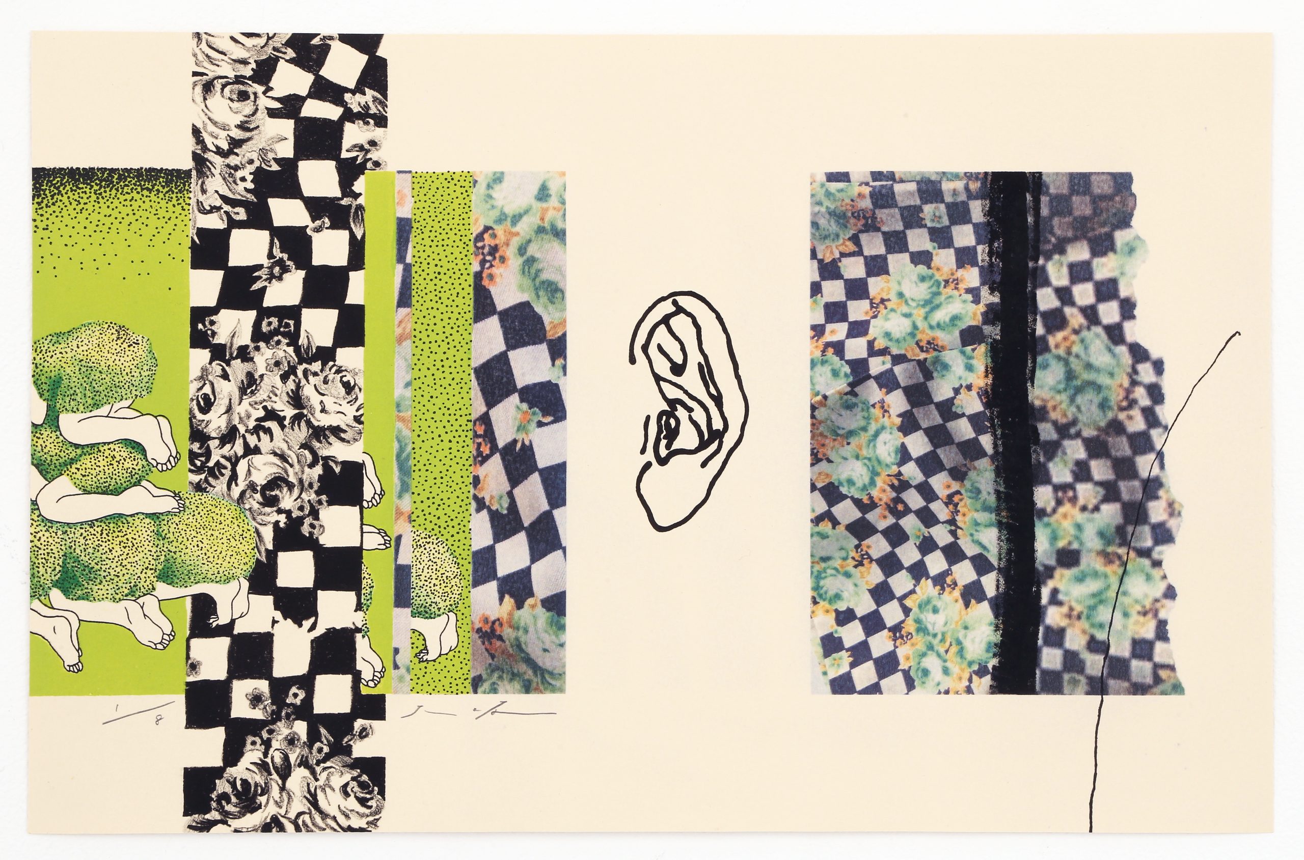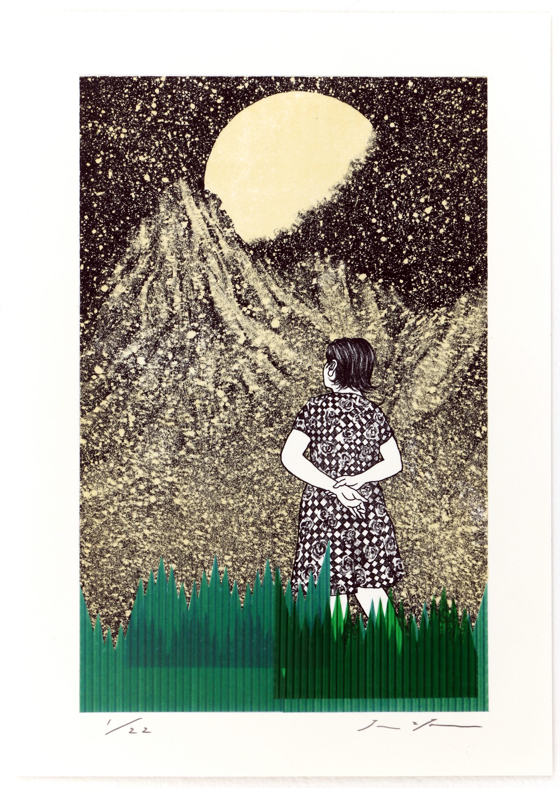 來⾃⽇本東京的⼤坂秩加(Chika Osaka,1984-),近年來備受矚⽬,過去展覽成績斐然,並多次斬獲⽇本國內外獎項肯定。⼤坂秩加的創作源⾃其對凡常⽣活的凝視與感悟,擅長透過純熟的⽇本傳統⽊版畫、平版畫技巧,結合攝影照⽚輸出、異材質拼貼等⼿法,將平素的所⾒所思轉換為符碼,作品意象⽣動,饒富巧思,呈現獨特的感性氛圍,又雜以詼諧調和,搭配⼜⽩式的簡短⾏⽂,圖⽂相互闡釋,來⾃⽇常的傾訴,就這麼穿透了靈魂,直達⼼扉。
