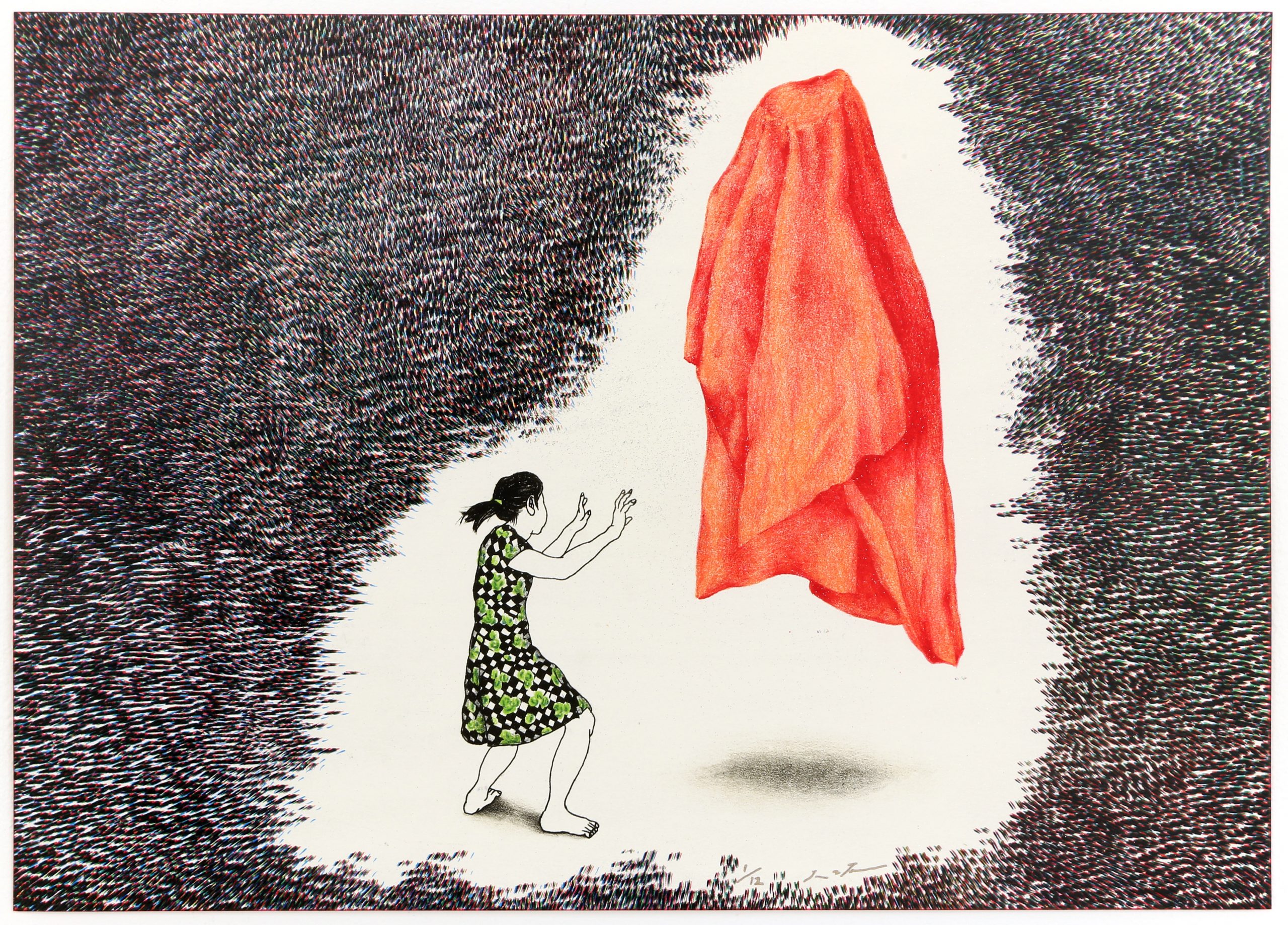 ⼤坂秩加2020年個展「幫我拉⼀下背後的拉鍊,好嗎?Zipper of My Back, Please.」,主角是⼀襲與藝術家邂逅於古著店的六〇年代綠⾊玫瑰圖案洋裝。久經歲⽉的洗禮,在物、⼈與時間的共同作⽤下,衣料⾊褪磨損與修改縫補的痕跡,反倒使原本來⾃⼤量⽣產的成衣成為獨⼀無⼆的存在,也激發了⼤坂秩加以這件洋裝進⾏系列創作的想像。