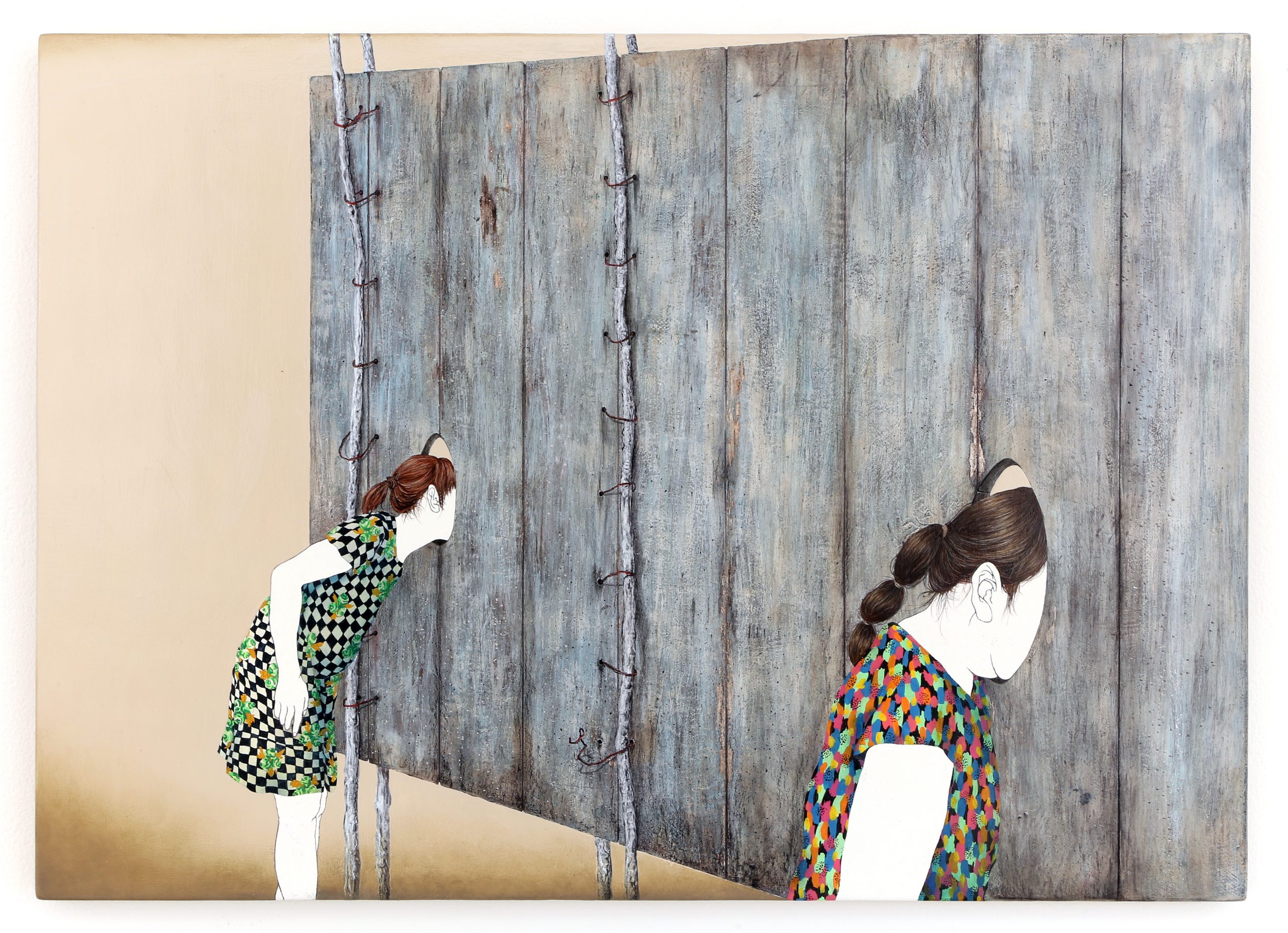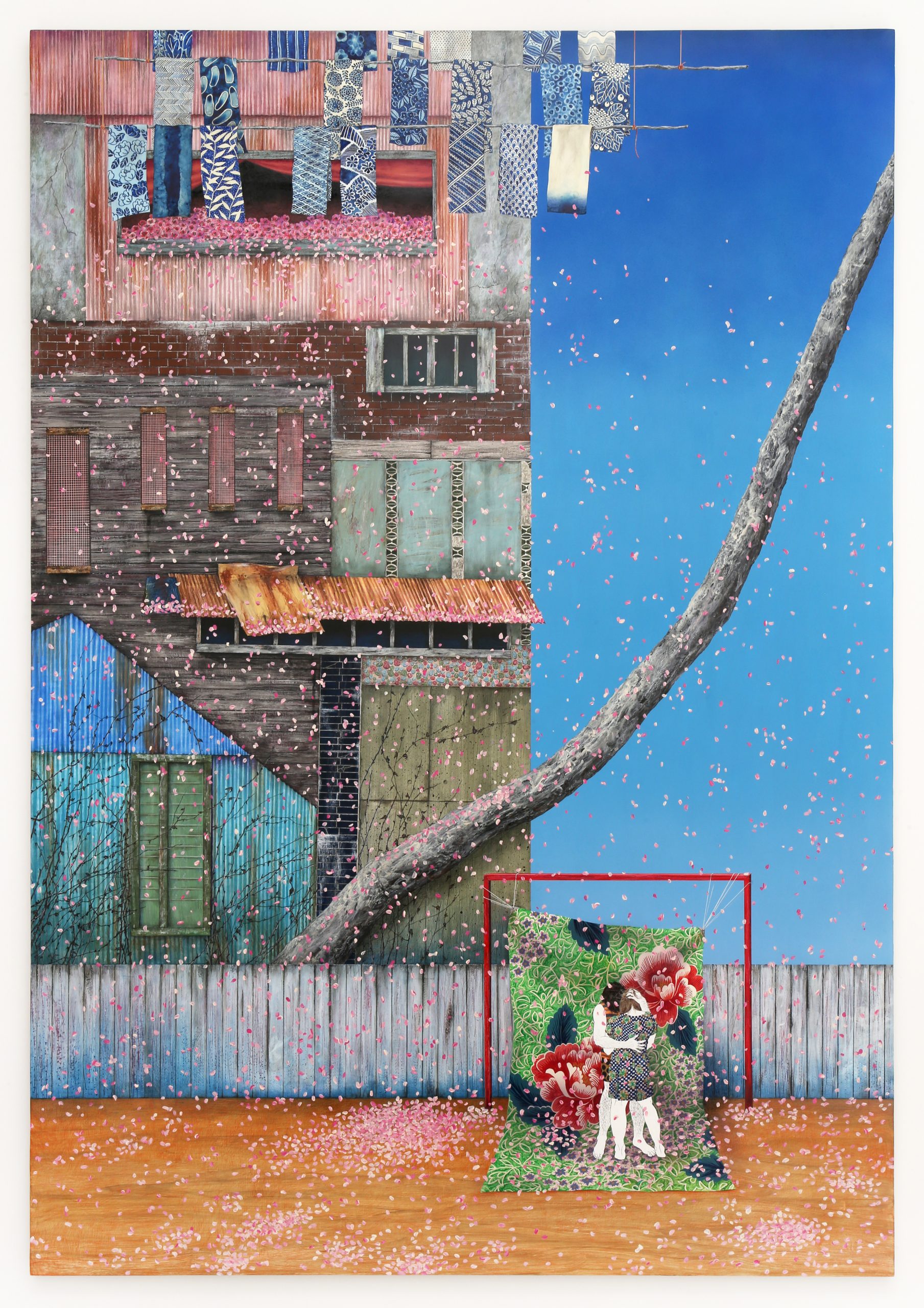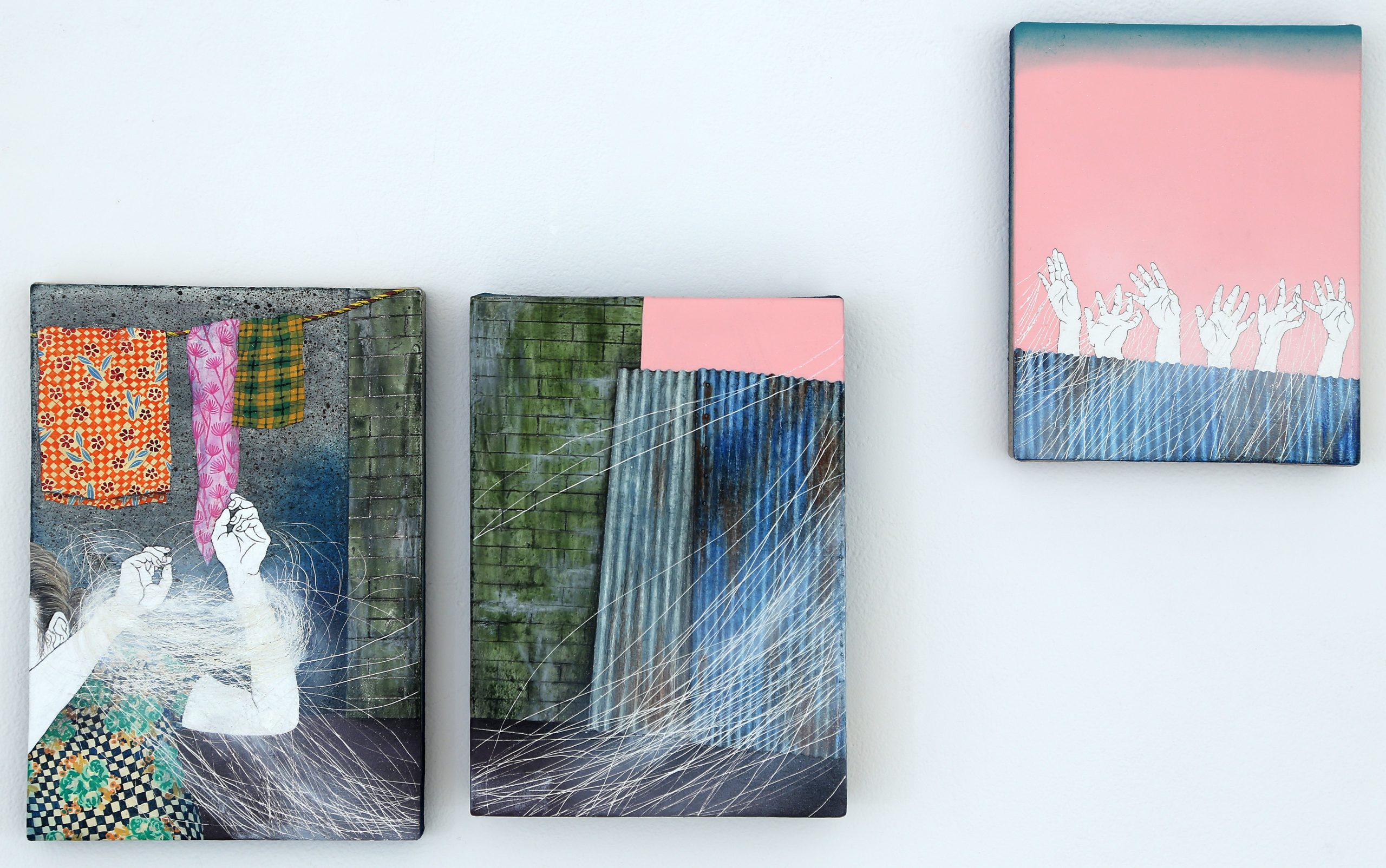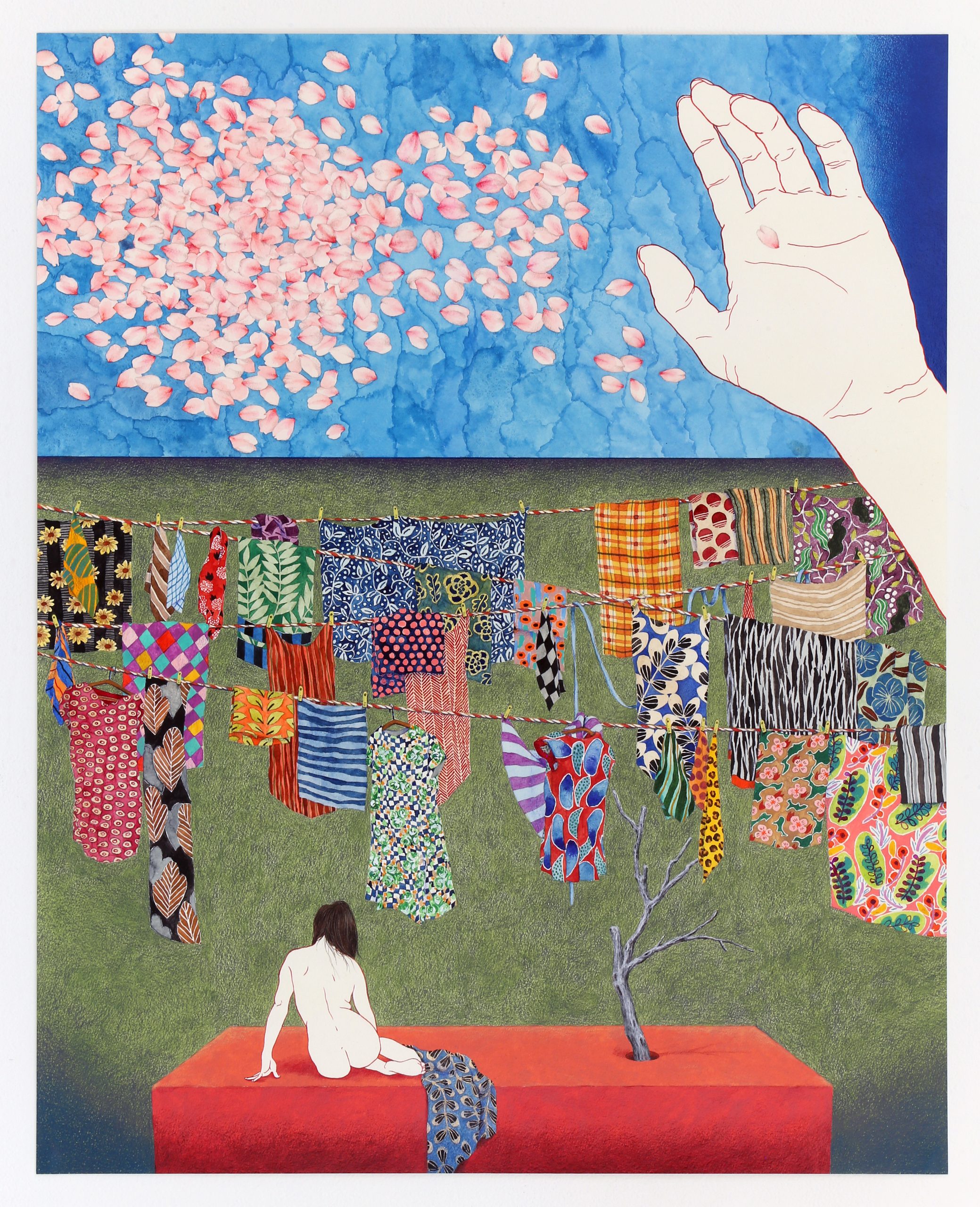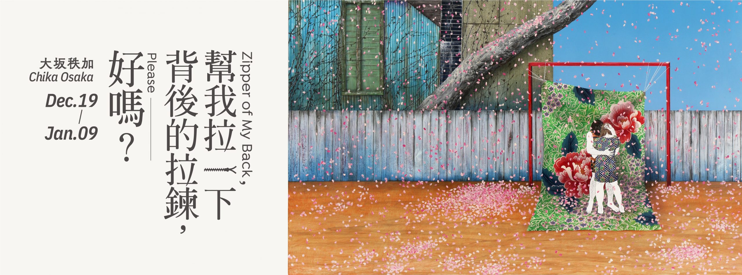 展覽名稱《幫我拉⼀下背後的拉鍊,好嗎?》 來⾃同名作品,藝術家透過形單影隻的女⼦憑⼀⼰之⼒搆不著洋裝背後拉鍊的窘境,發出「就算是這隨處可⾒又毫無魅⼒的身體,也有被愛的⼀天嗎︖」之喟嘆,前景的⽩⾁雞是幽默的呼應;又如在〈總是主角〉中,佇⽴的樓房、繽紛落英與華麗的牡丹布匹搭建起舞台般的佈景,「不管何時我都是⾃⼰的主角」沈浸在擁抱中的洋裝少女如是說。