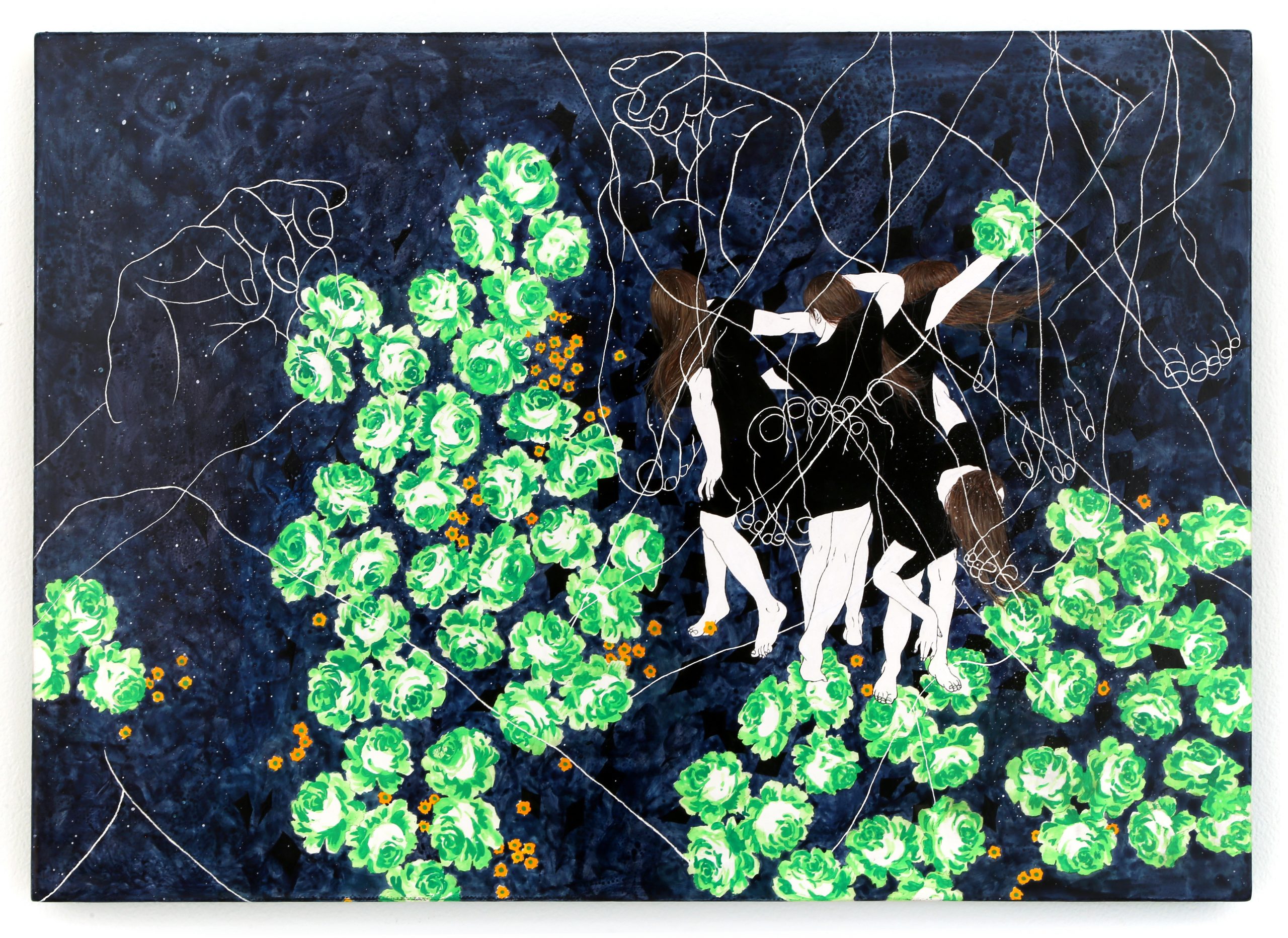 古著洋裝彷彿成為身處時間洪流之中世間萬物的縮影,藝術家試圖為洋裝編造脈絡,忖度其曾經的主⼈們所身處的情境,是懷著什麼樣的⼼情,在什麼樣的⽇⼦穿上了它? 曾經與它⼀起被緊緊地擁抱嗎? 盛開的綠⾊玫瑰又陪伴著她們⾛過了哪些⽣命的風景呢︖特別值得⼀提的是,綠⾊玫瑰的花語是「我可以擁有希望」以及「平靜」,對照此時此刻正遭逢新冠病毒(Covid-19)肆虐⽽躁動不安的世界,這份祈願在六⼗年後的今天也依然適⽤。