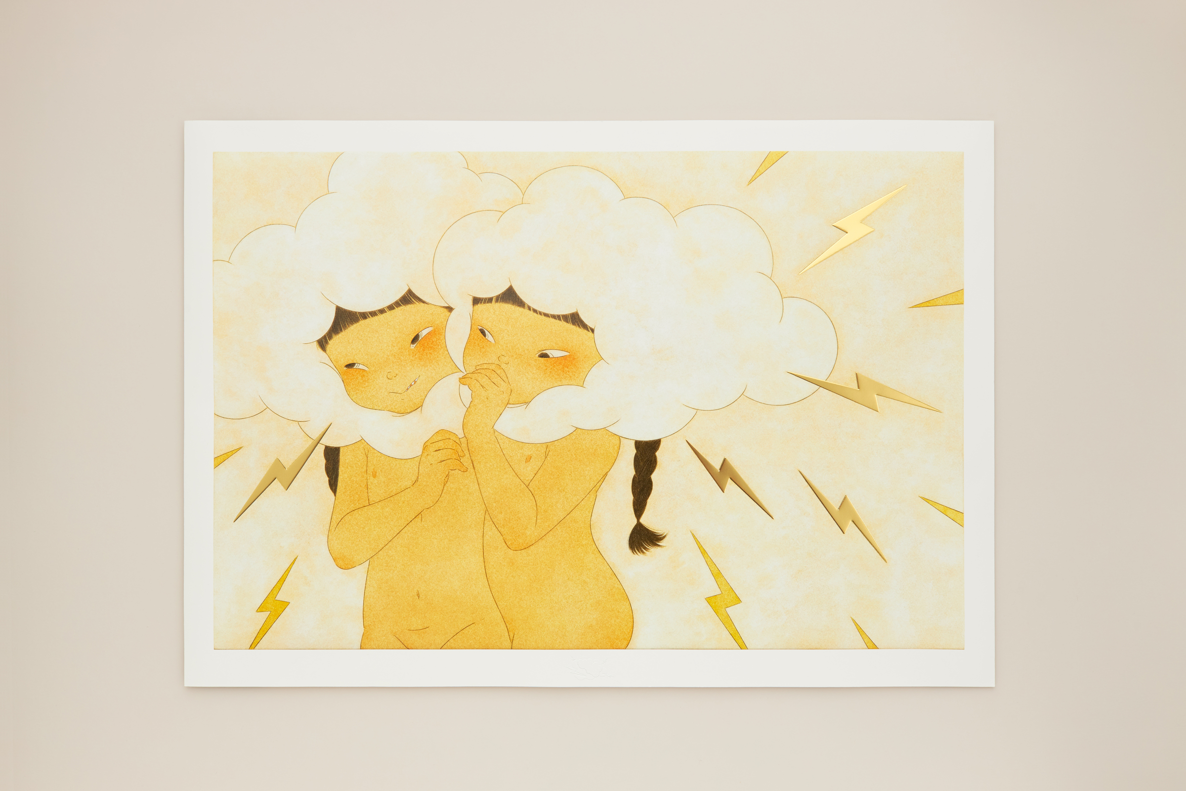 與今年夏天推出的’Pili & Ame’原作為同一系列的作品。與中田初步討論製作時,我們都希望在版畫上增加一些特別的元素,想像過各種可能,最後我們在畫面中選了幾道奔放的閃電燙上金箔,以及局部凸面加工處理,底邊還有精緻的雲朵和閃電浮雕印記,讓版畫在不同角度看去,金箔閃閃耀動,整體更加別具特色。